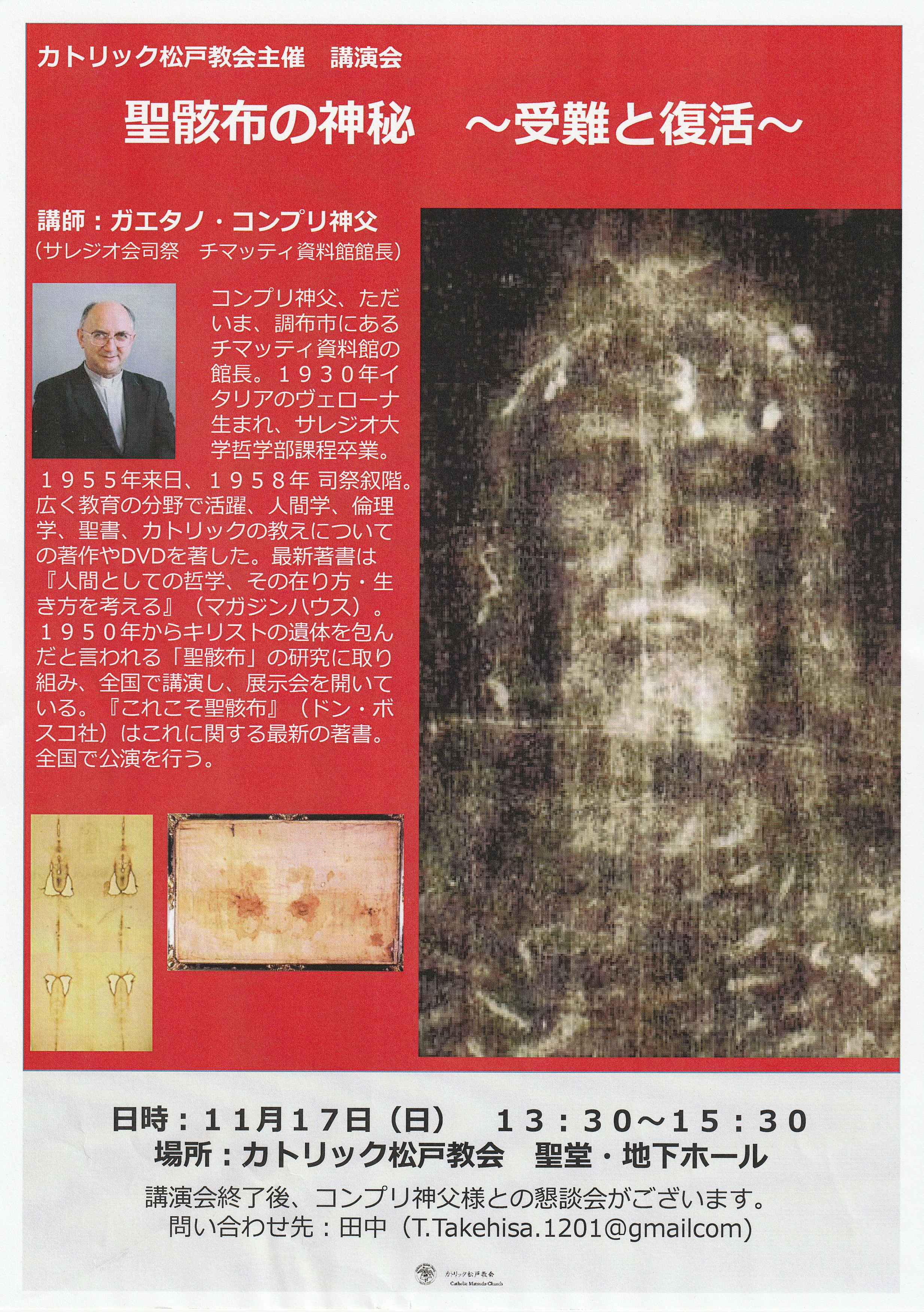 コンプリ神父と行く聖骸布一般公開と北イタリア巡礼の案内および聖骸布講座開講の案内を公開しました。ページ上部のロゴをクリックしてください。